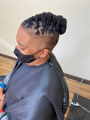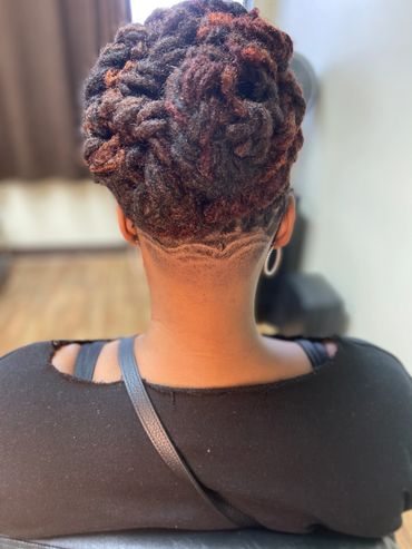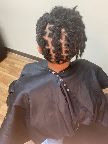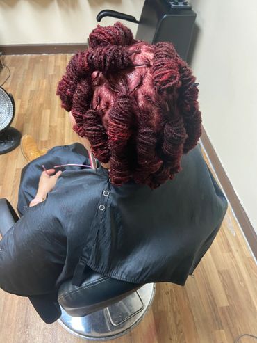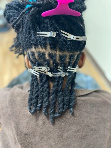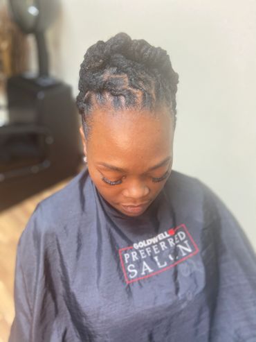 Re-twisting of new growth and a styling (two strand rope twist, up-do, braiding Locs, etc.)